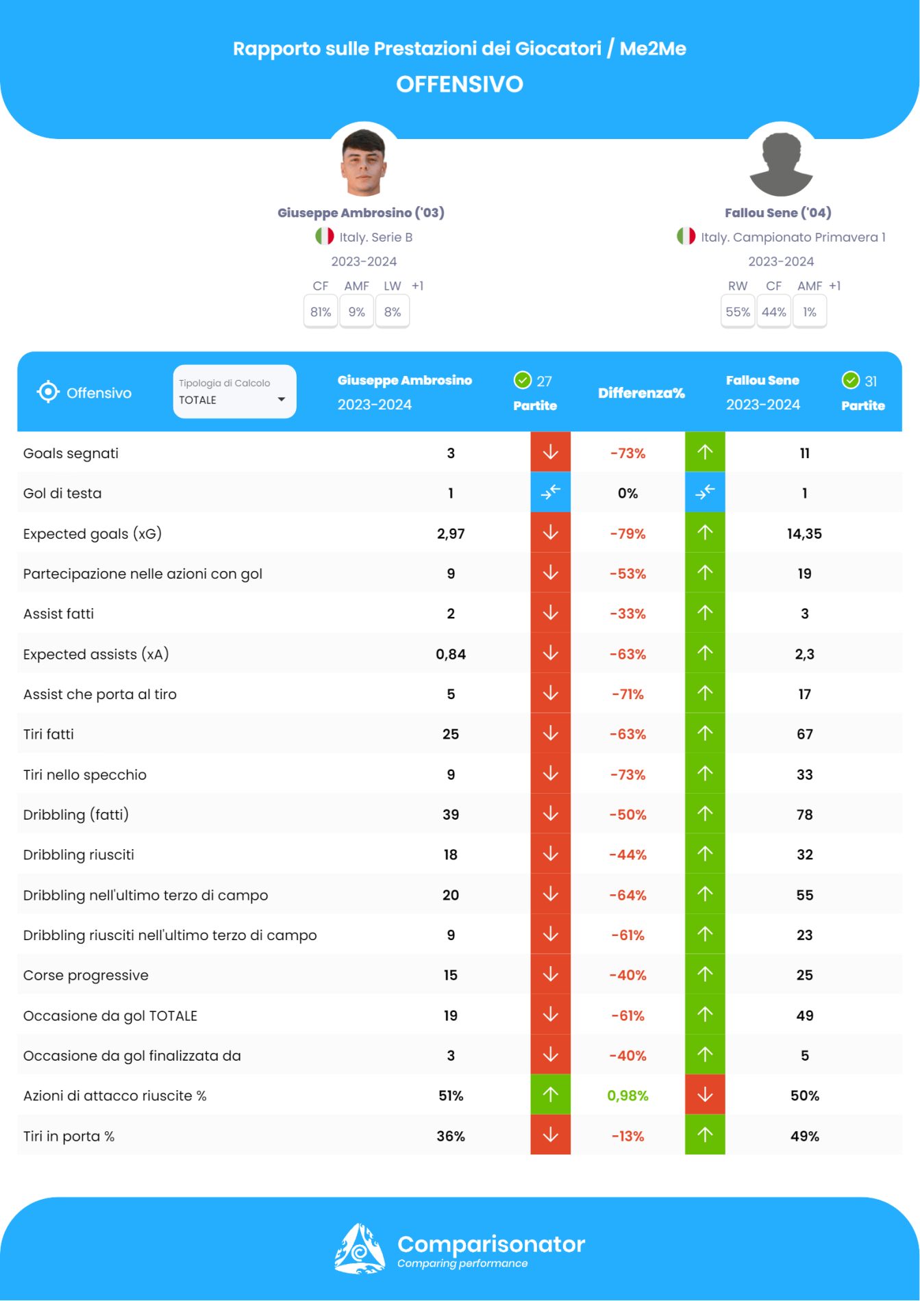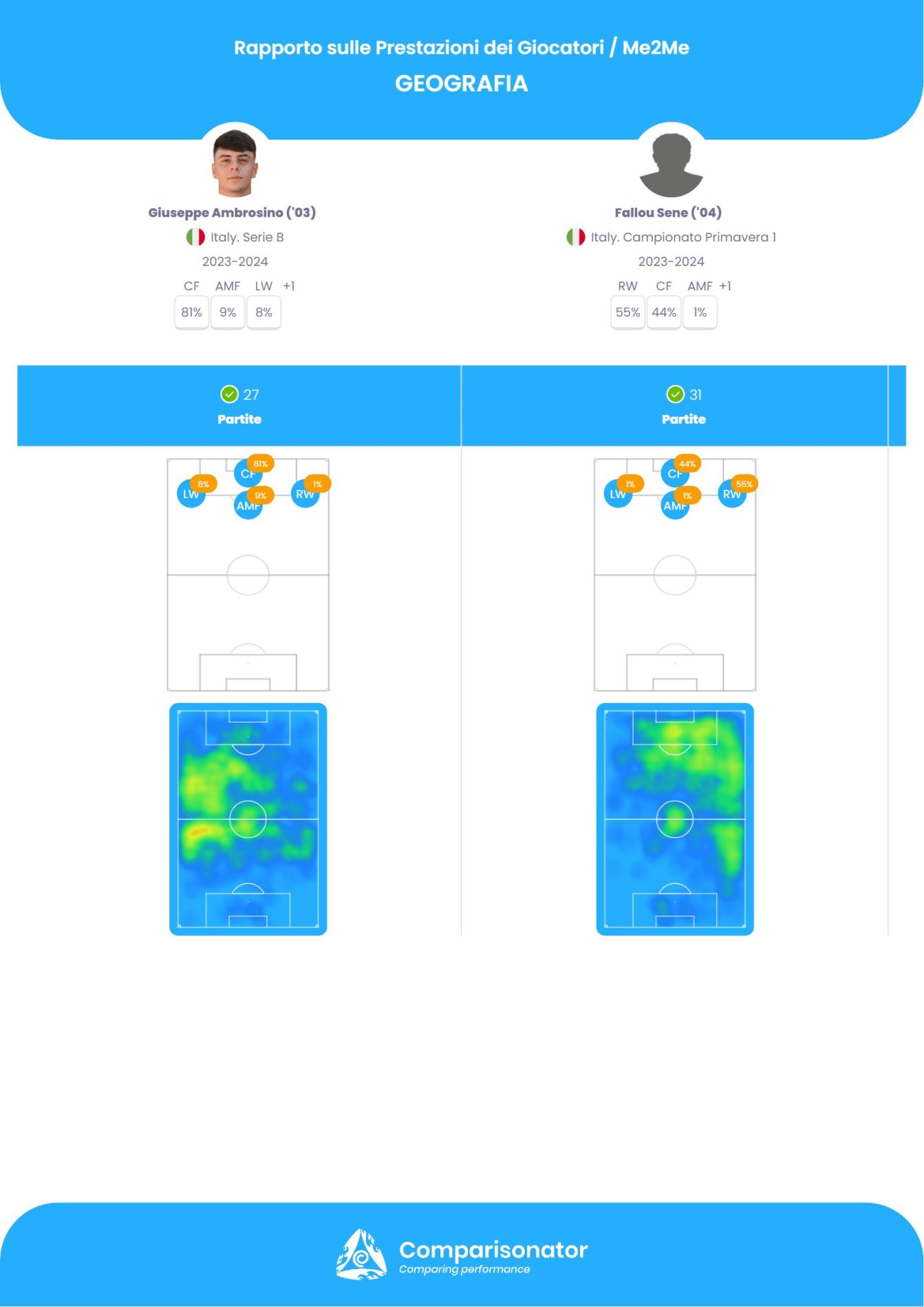 Da qui alle prossime settimane, a causa degli infortuni di Tsadjout e Pecorino, il Frosinone avrà a disposizione solo due attaccanti: Giuseppe Ambrosino e Fallou Sene. I due saranno costretti a giocare come riferimenti offensivi, pur non essendo delle vere e proprie prime punte. Confrontando i loro dati su Comparisonator.com, si può vedere dalla Heat Map che i due prediligono agire sulle fasce piuttosto che al centro.