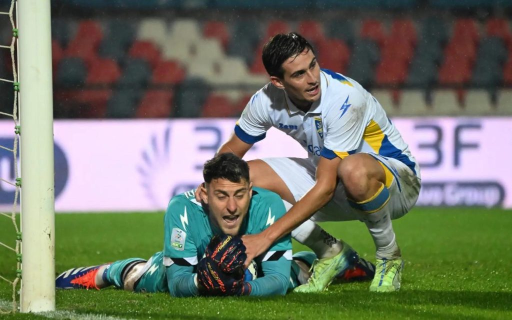 Monterisi tocca il pallone con le mani dopo un abbraccio a Cerofolini: i rossoblù protestano per il rigore non assegnato...