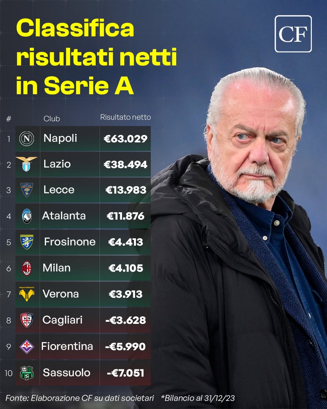 Il Frosinone in questa particolare classifica è messo molto bene: infatti il club giallazzurro si è posizionato al 5° posto con un utile di 4,4 milioni di euro (dati al 31/12/2023) alle spalle solamente di Napoli, Lazio, Lecce e Atalanta.