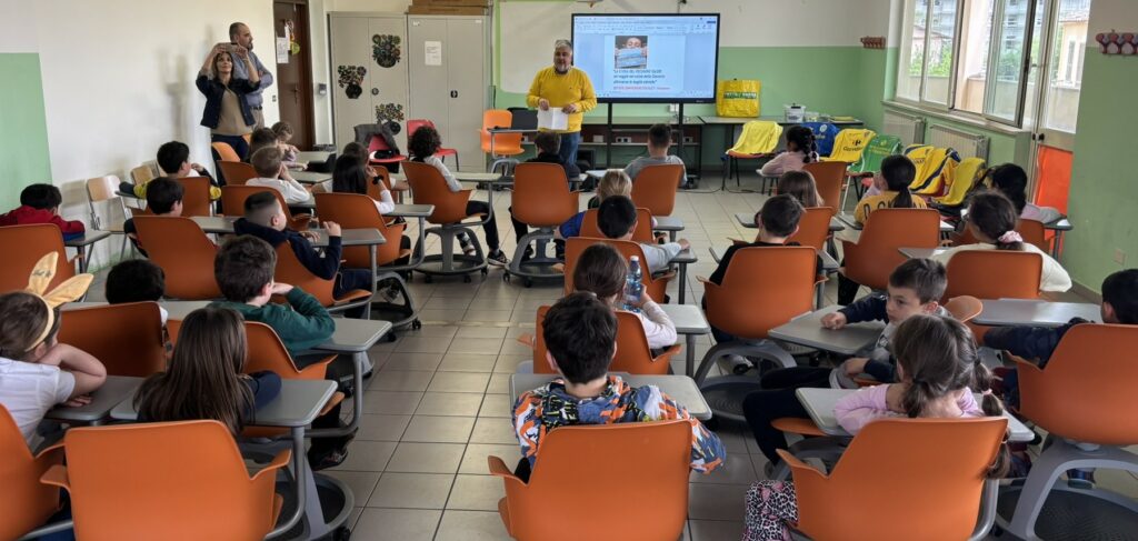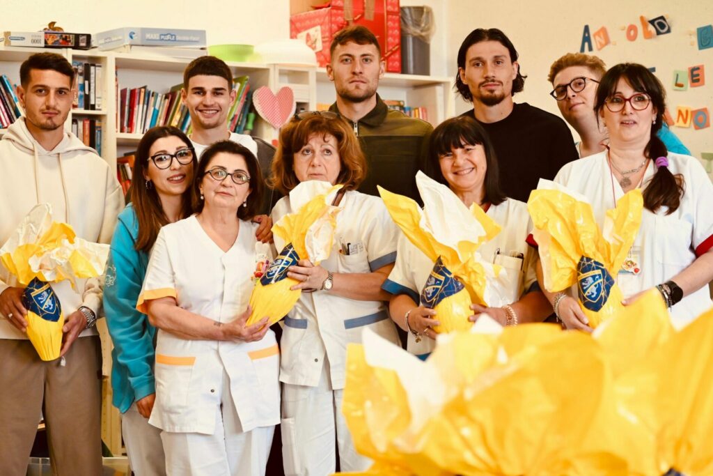 A consegnare i doni i calciatori Michele Cerofolini, Anthony Partipilo, Davide Bettella e Ilias Koutsoupias...